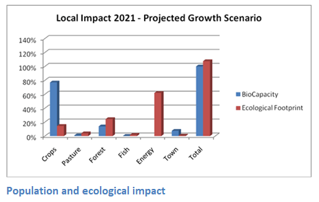 However, we have also been asked to explore the social, environmental, and cultural aspects of population dynamics. In the Town of Minto, we used population forecasts to determine the impact of community growth. Having gone through an amalgamation, they wished to expand their tax-base to help meet fiscal responsibilities. The current rate of growth was used to project the population out 10 years to contrast it with other population targets. These growth scenarios were used to calculate the Ecological Footprint of such expansion. This analysis provided several growth options for their Integrated Sustainability Community Plan. Each option had a corresponding implication for how the landscape is used and for the design of the built-environment.